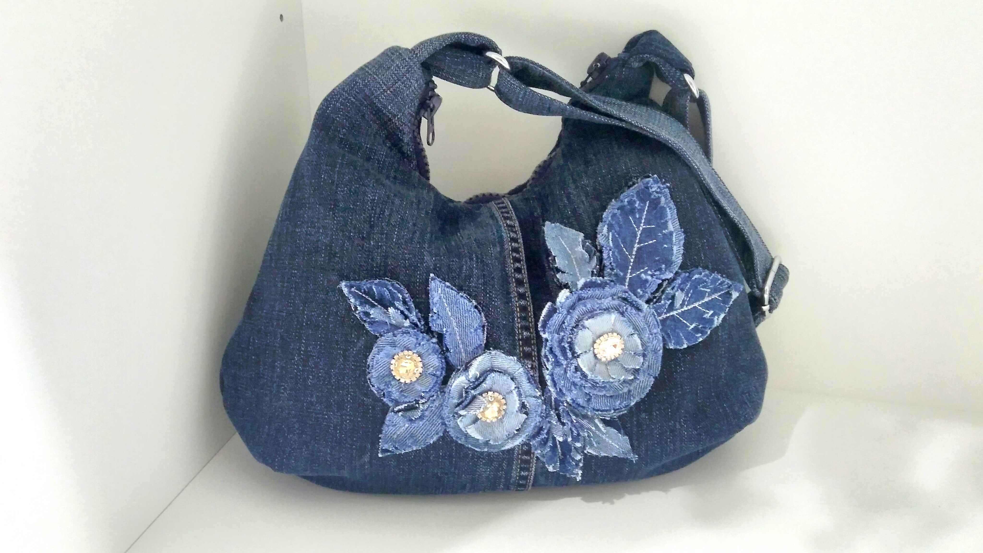 Добрый день!!! Как только выпадают у меня свободные от основной работы деньки, так я сразу придумываю чем заняться... В один из таких августовских дней решила порадовать себя новой сумочкой, да и материалы для этого были, пара- тройка старых рваных джинс...И вообще я стараюсь джинсы не выбрасывать, всегда есть возможность воспользоваться кусочком джинсовой ткани. В интернете накопала различных выкроек сумочек и дело пошло, решила, что без аппликации ни как, два дня просидела за шитьем и вот что получилось...