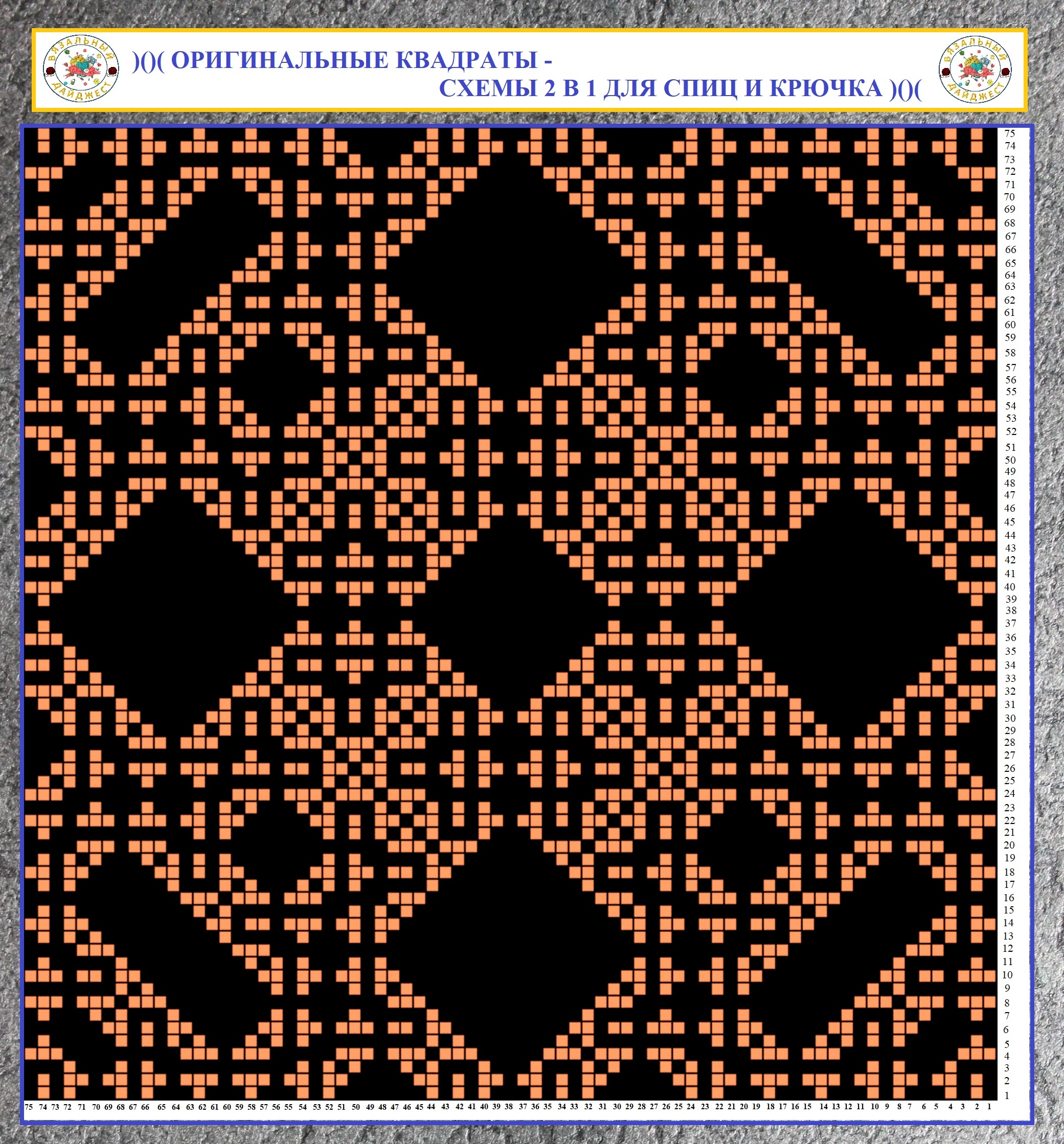 - Квадратом большого размера (75 клеток х 75 клеток) можно связать плед или покрывало, его схемы хватит на целое изделие, останется только выбрать пряжу и ваше любимое цветовое сочетание.