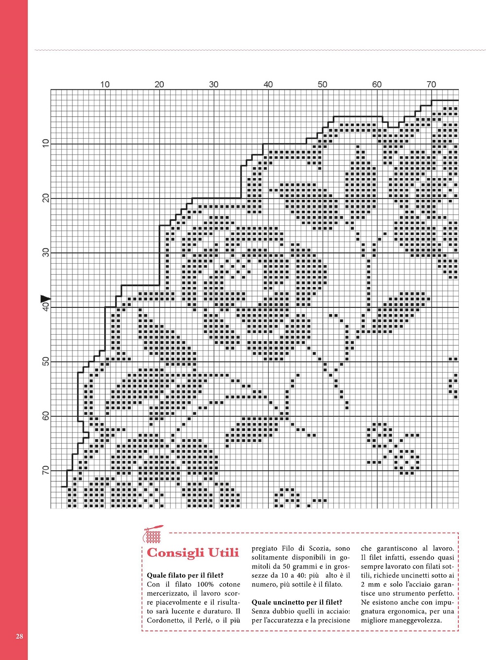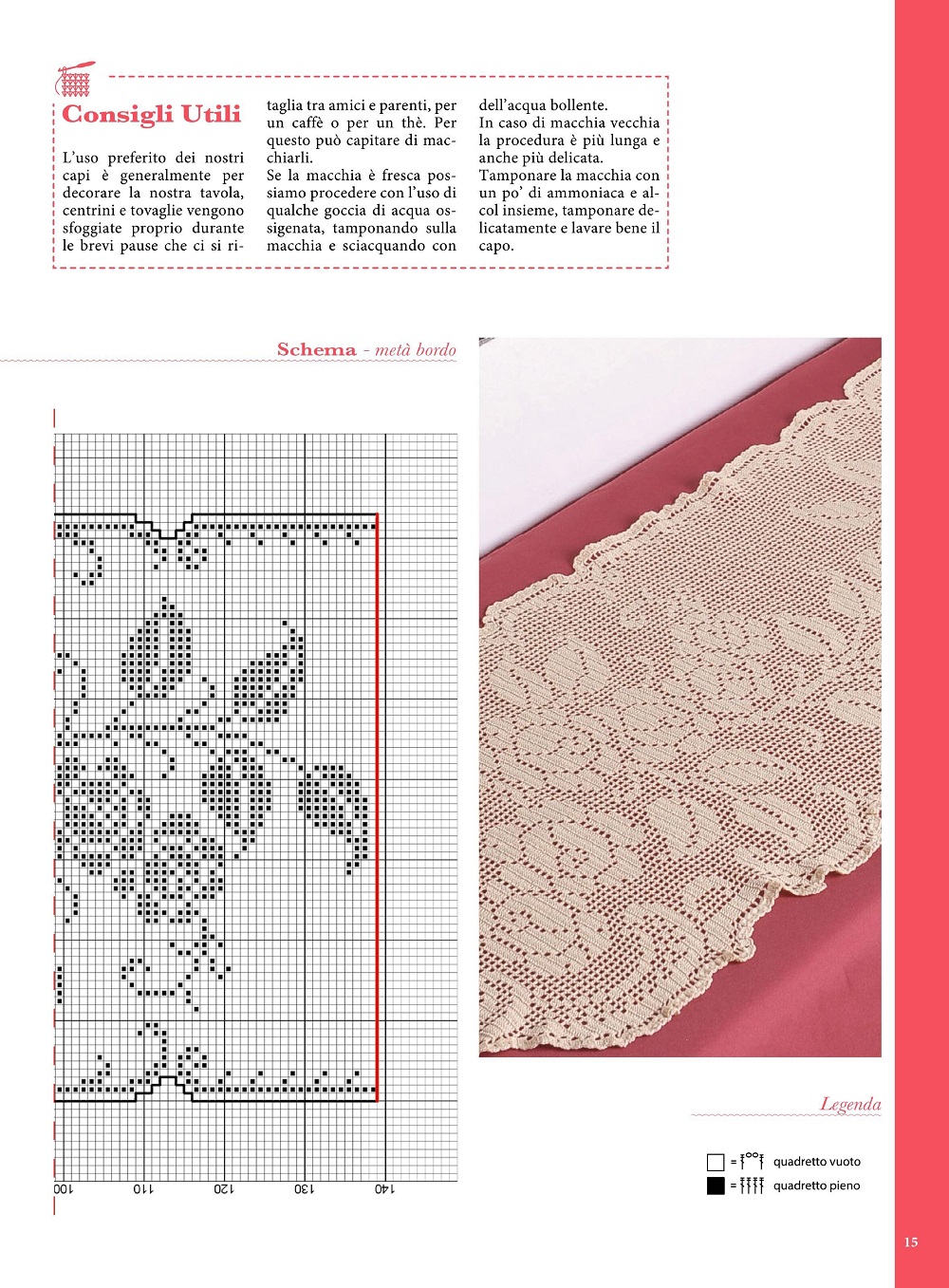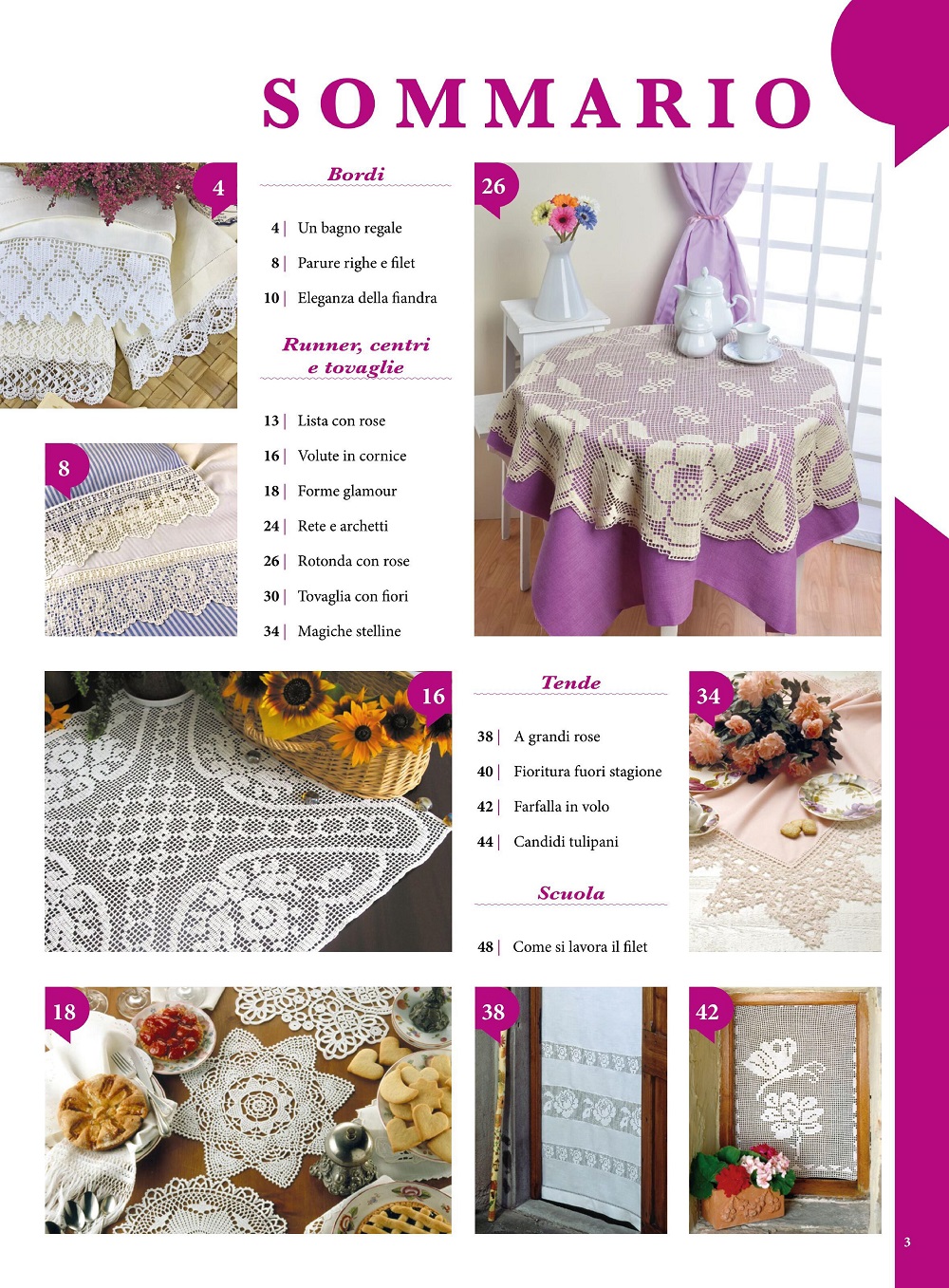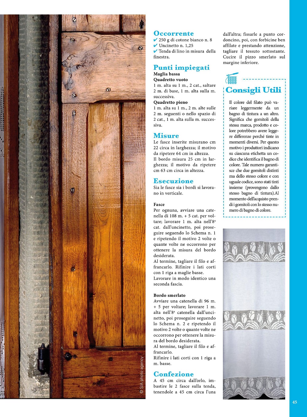 Итальянский журнал по вязанию крючком и вышивке крестиком. В каждом номере проекты и идеи для создания уюта в вашем доме: занавески, бордюры, салфетки, кайма, связанные крючком в филейной технике. А также сумки, пледы, подушки, коврики, прихватки и многое другое.