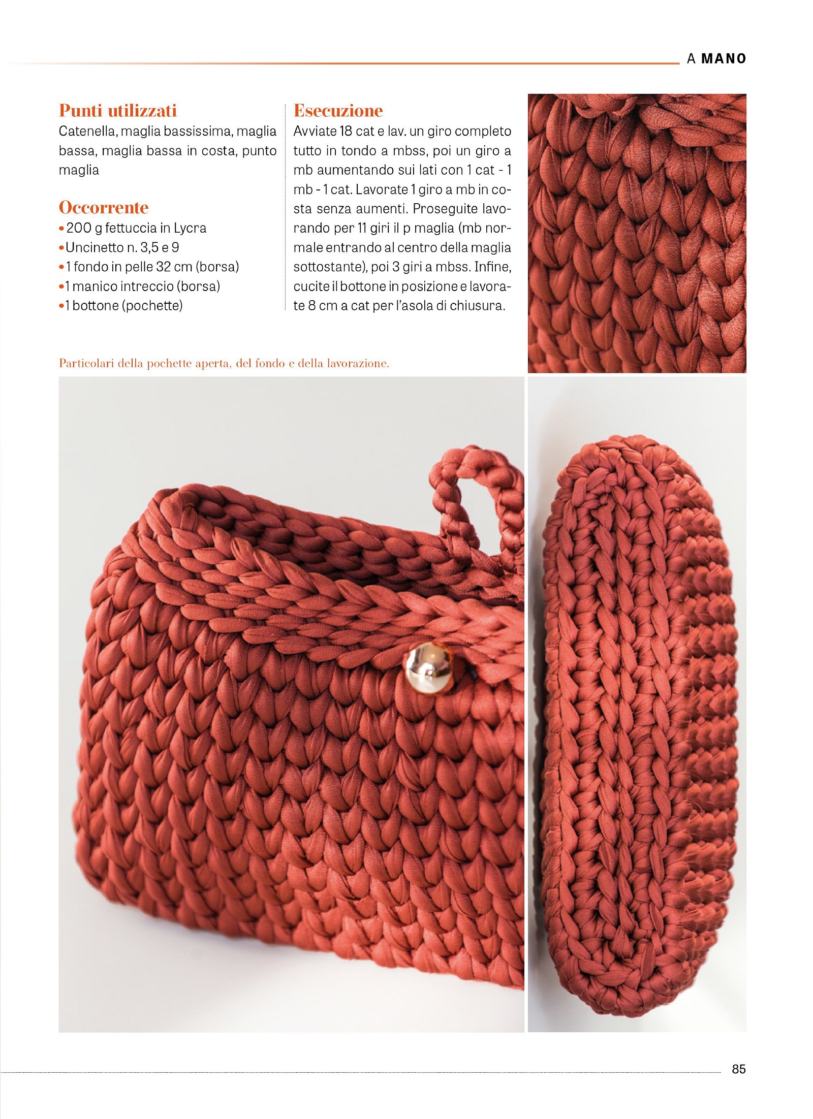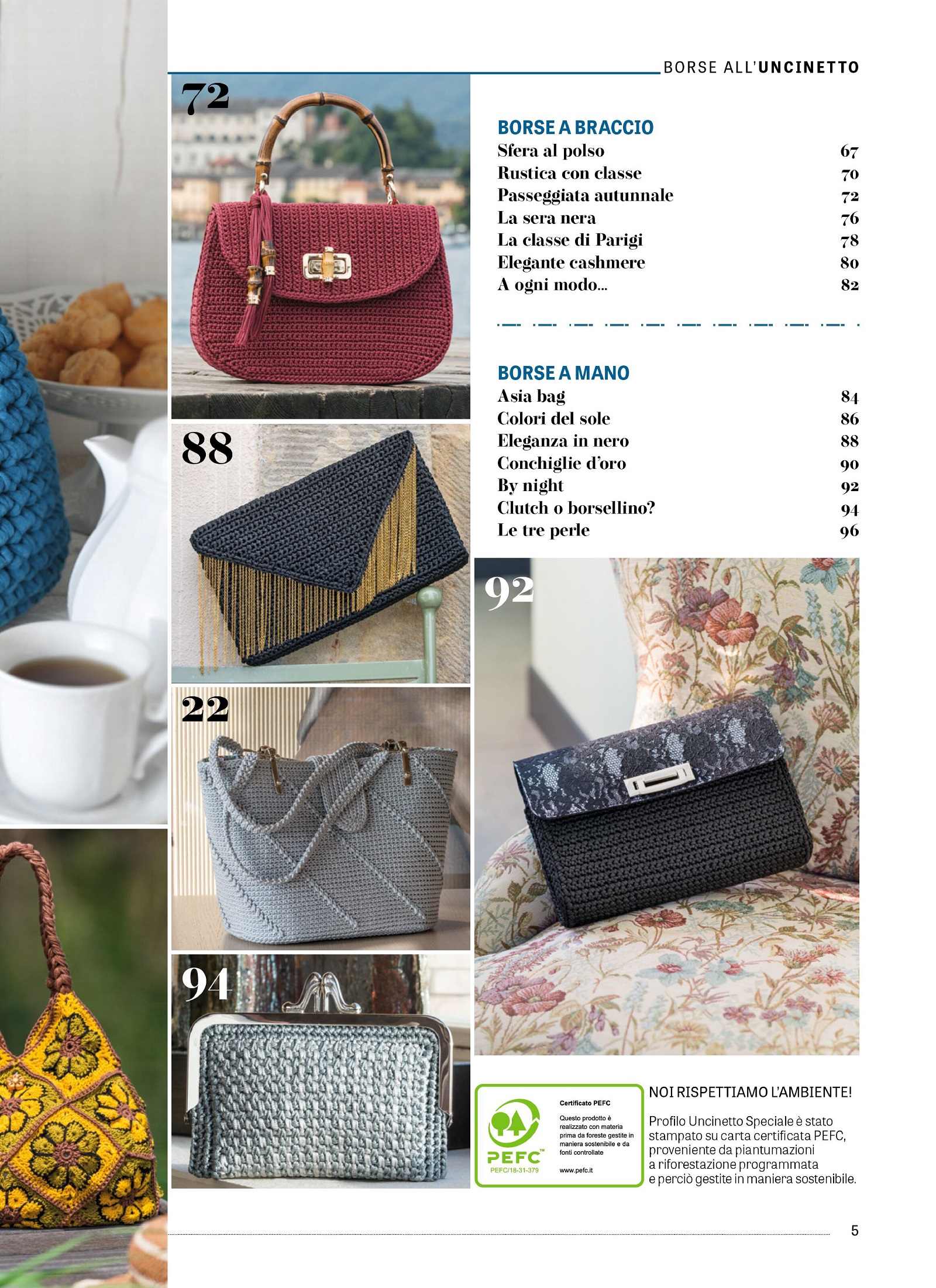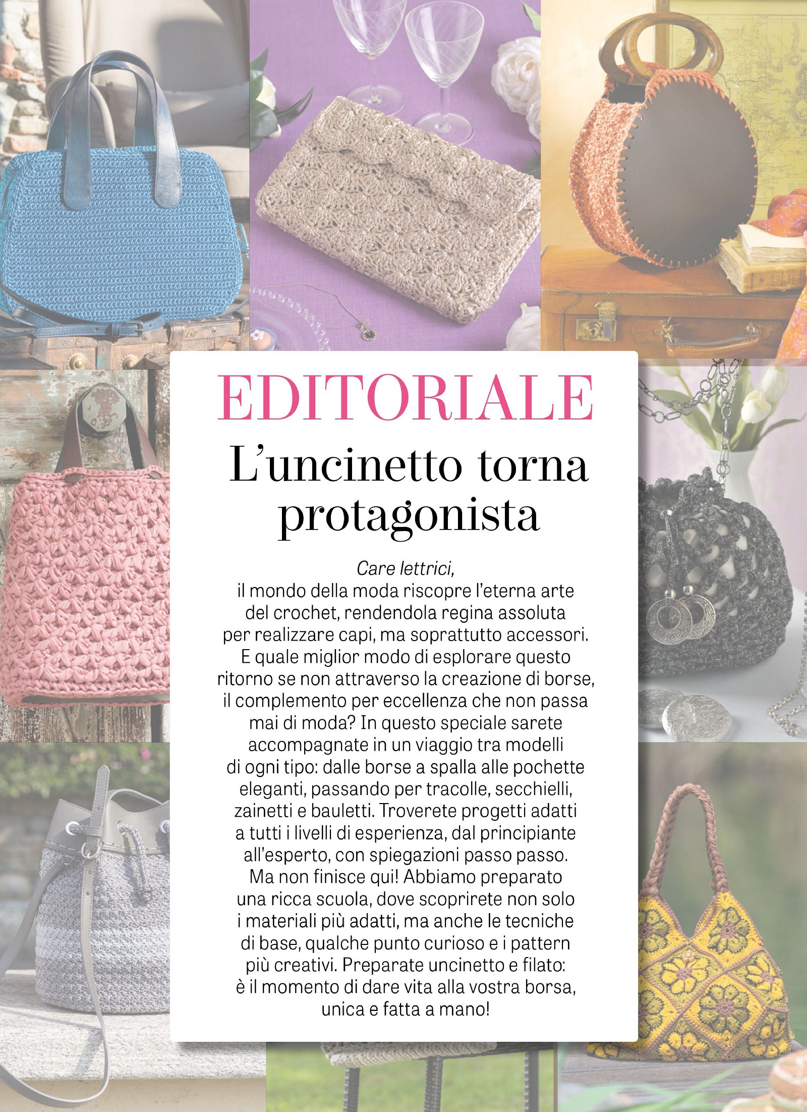 Итальянский журнал по вязанию крючком. В каждом номере проекты и идеи для создания уюта в вашем доме: занавески, бордюры, салфетки, кайма, связанные крючком в филейной технике. Новый спецвыпуск посвящен вязанию сумок.