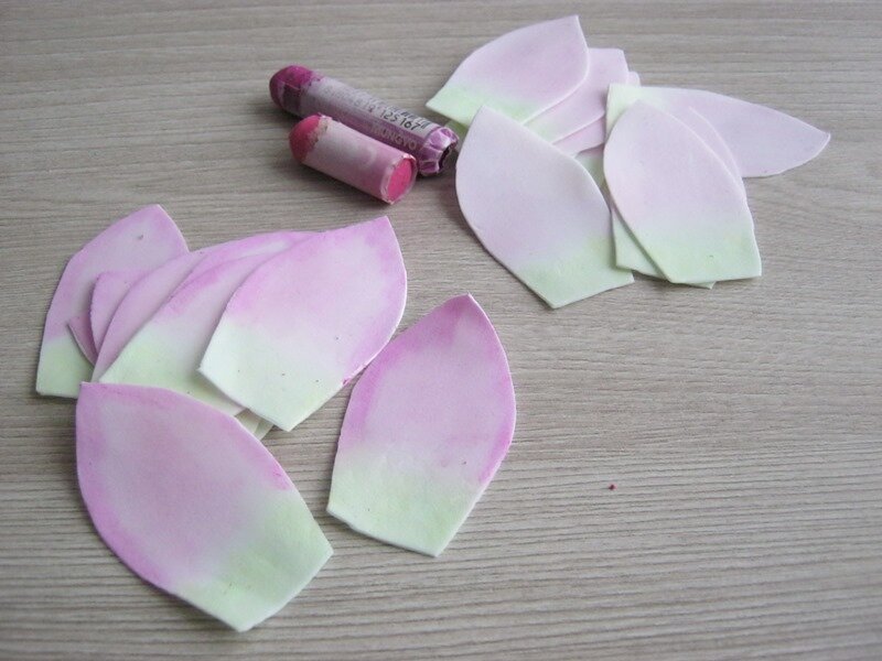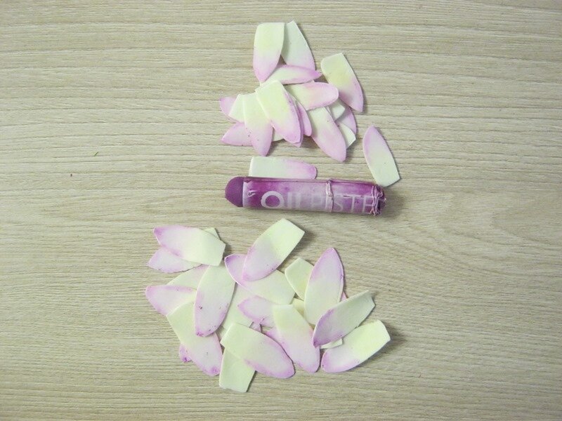 Для нанесения цвета я использовала масляную пастель. Тонировку нужно производить с обеих сторон.