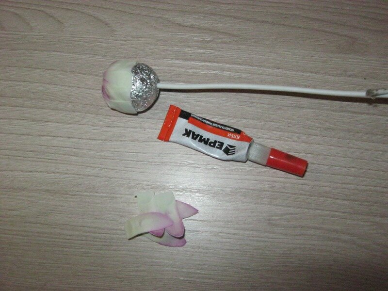 В качестве стебля подойдет провод. К нему я приклеила шарик секундным клеем.