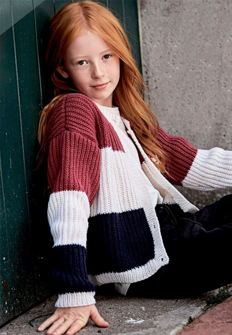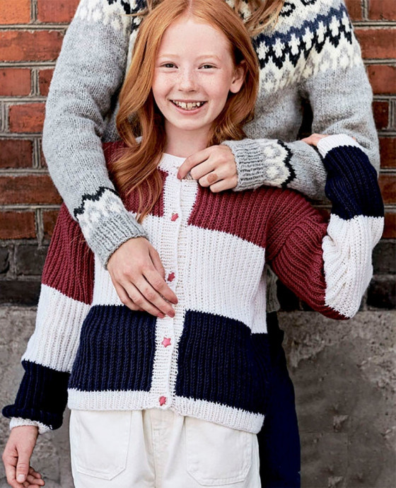 Пряжа Schachenmayr, Мerino Extrafine 120 (100% шерсти; 50 г/120 м) – 3 (3) 3 мотка темно-синей (цвет 00150); 3 (4) 4 мотка белой (цвет 00101) 3 (3) 4 мотка ягодной (цвет 10132); прямые спицы № 4; круговые спицы № 4 длиной 80 см; 5 пуговиц диаметром 15 мм.