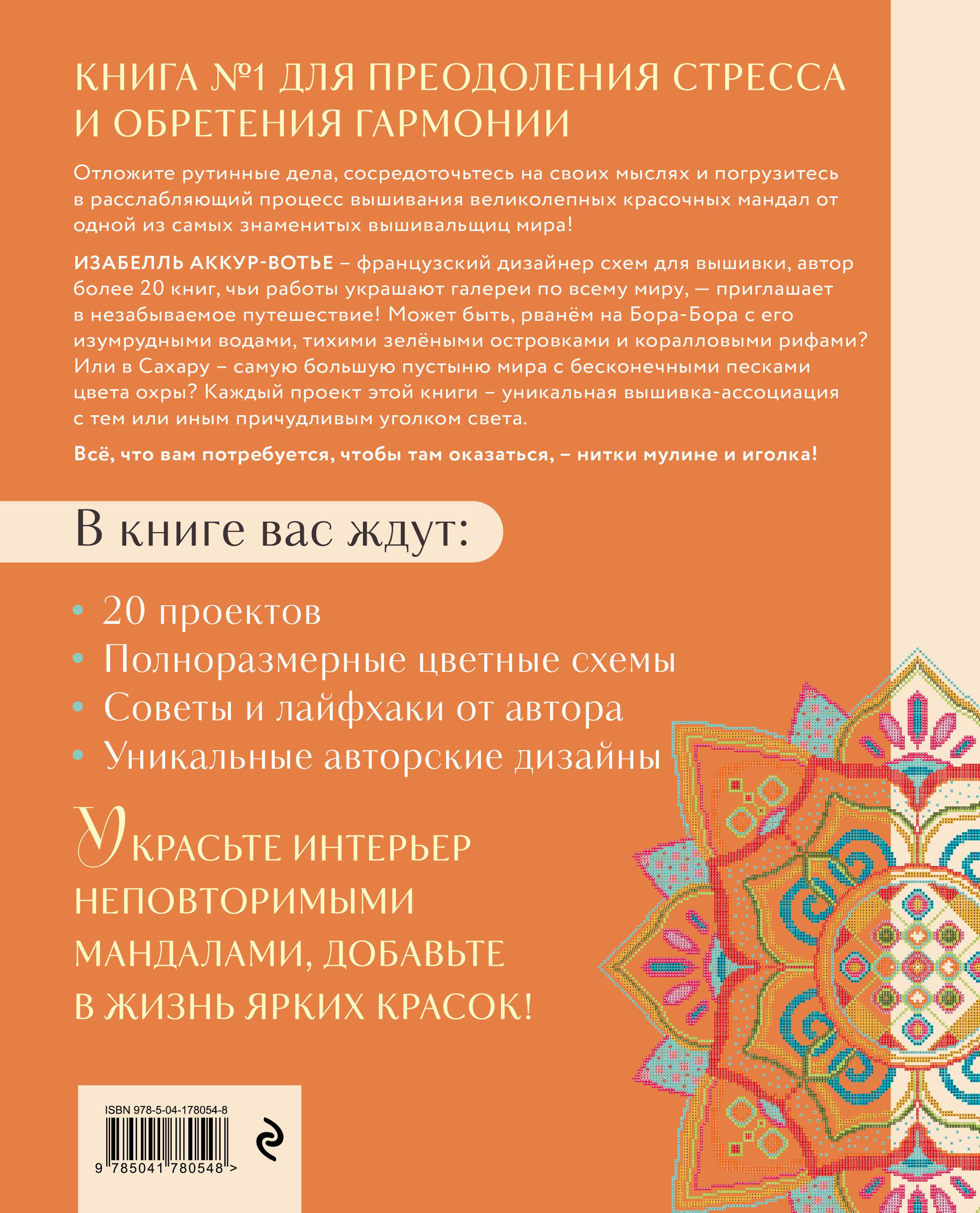 Новинка от известной французской вышивальщицы, дизайнера и автора более 20 книг - Изабель Аккур-Вотье! Это не просто руководство, а ваш проводник в увлекательном путешествии по миру мандал, созданных для достижения гармонии и преодоления стресса. Вас ждут 20 невероятных авторских дизайнов, снабженных цветными схемами и цветовыми картами.
