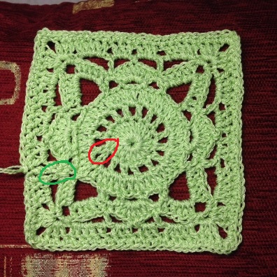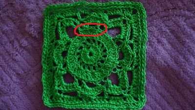 Зеленая отметка — в этом месте небольшая ошибочка — лишний столбик с накидом. Вот в этом месте вам нужно завершать ряд таким образом — 3 воздушные петли и соединительный столбик в 3-ю верхнюю воздушную петлю подъема. Эти пели подъема служат необходимым столбиком с накидом, рядом с ними не нужно провязывать дополнительный.