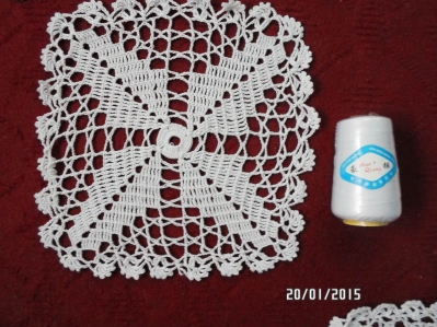 5. Теперь аккуратненько прикалываем, затем наметываем и наконец настрачиваем наше кружевное квадратное вязание на лицевую сторону нашей тканюшки, уравнивая выступы кружева по трем краем (кружево должно одинаково выступать по всем 3 краешками ткани) машинная строчка должна отступать от края примерно 1,5 см.
