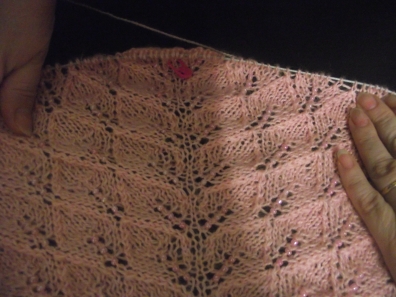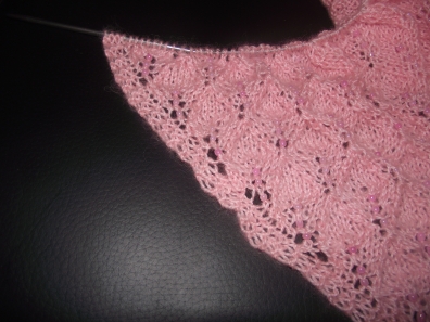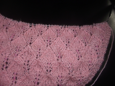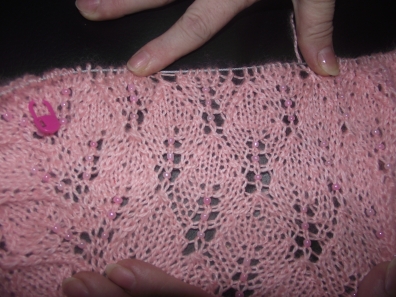 Здесь же у нас идет ажурный рисунок, повторяющийся. Девушкам важно для себя понять что в раппорте 10 петель строго. И быть внимательными в подсчете петель в «розовых клеточках».