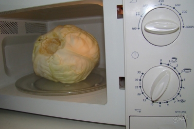 «Вымой кочан, сними несколько верхних листьев, удали кочерыжку и положи капусту в микроволновую печь. Если она весит 1,5–2 кг, тогда нужно установить режим 900 Вт приблизительно на 12 минут.»