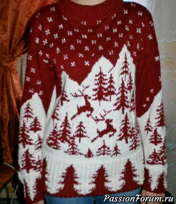Свитер связан из пряжи "деревенская" (Пехорка) 100% шерсть 100гр = 250 м очень простеньким жаккардом. На свитер ушло 550 гр. Горловина - высокая стойка с двойным отворотом . На резинке снизу сделала шлицу на две пуговицы - изделие довольно длинное, ниже бедер и мне не хотелось слишком стягивать низ резинкой. Пряжа очень колючая, носить такой свитер можно только в очень сильный мороз.