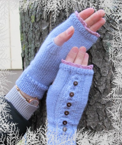 Какую бы пряжу я ни брала для этих варежек, узор, почему-то, все время начинал косить Поэтому решила связать хотя бы митенки. Со стороны ладони просто лицевая гладь. Пряжа Ализе Альпака роял нью, спицы чулочные №3,25. Прибавки для большого пальца здесь не делаются, но я все-таки сделала. Прибавила 11 петель. Отверстие для пальца сделала на уровне 30-го ряда узора. После 5-го раппорта убавила в узоре 6 петель (48 п.). В конце 6 рядов резинки. На пальце 2 ряда лиц. глади и 4 ряда резинки. Ра...