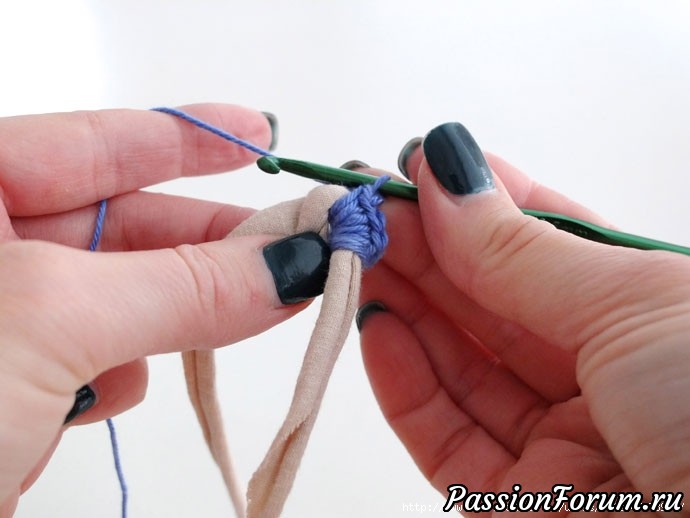 В моей копилочке "лежала" идея из интернета, как по-новому связать круглый половичок. Недавно захотелось попробовать связать. Технирка несложная, но интересная - используем нарезанное на полоски полотно (трикотажное или обычное тканое), обвязывая крючком. На фотографиях все видно и понятно. На первых трех фотографиях - этапы процесса вязания из МК. Следующие фото - это мой коврик. Материал - нарезанные на полоски носочки хб. Для обвязки использовала хб пряжу двух цветов (распустила вязаный летний джемп...
