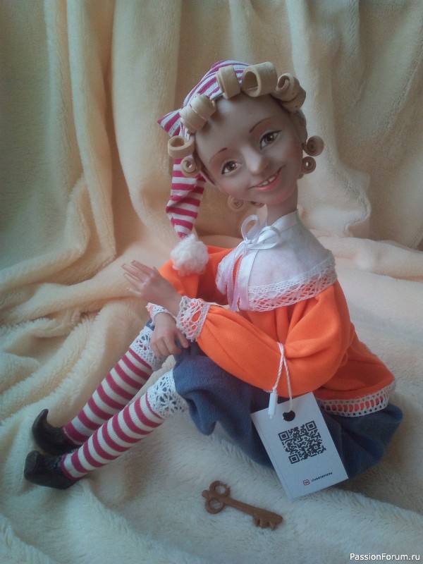 Очередная кукла Арлекино, только скорее всего девочка, рюшечки, кружавчики)) нравится мне создавать подобный образ, столько можно фантазии в него вложить)) Кукла Арлекино ручной работы, ручная лепка, высота примерно 43 см. Кукла стоит сама, но всё же надёжнее с опорой или у стеночки. Голова из самозастывающей глины, руки и ноги из запекаемого пластика. Тело мягконабивное- синтепон,текстиль+проволока. Голова поворотная. В руках и ногах проволока. Одежда, колпак и обувь не съёмные. На шапочке и на сапожках ...