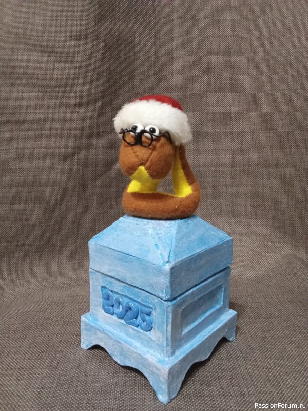 Предлагаю вариант украшения бутылки шампанского в стиле символики наступающего года! Понадобится: бутылка шампанского, нетканная салфетка, масса для лепки, молды, клей ПВА и любой полимерный, акриловые краски (черная и золотая), шпатлевка, трафарет, пластиковые веточки ели, резиновая змейка, акриловый лак. Бутылку обезжириваем и на центральную часть наносим узор "кирпичик" через трафарет шпатлевкой: После просушки оклеиваем бутылку салфеткой, предварительно смоченной в ПВА: Снова тщатель...