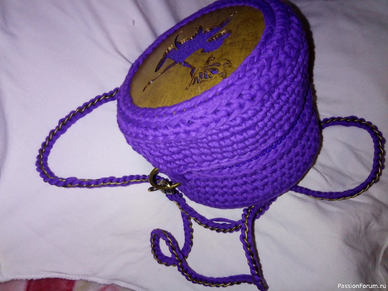 Сумочка вязанная крючком из тонкой трикотажной пряжи с деревянным донышком