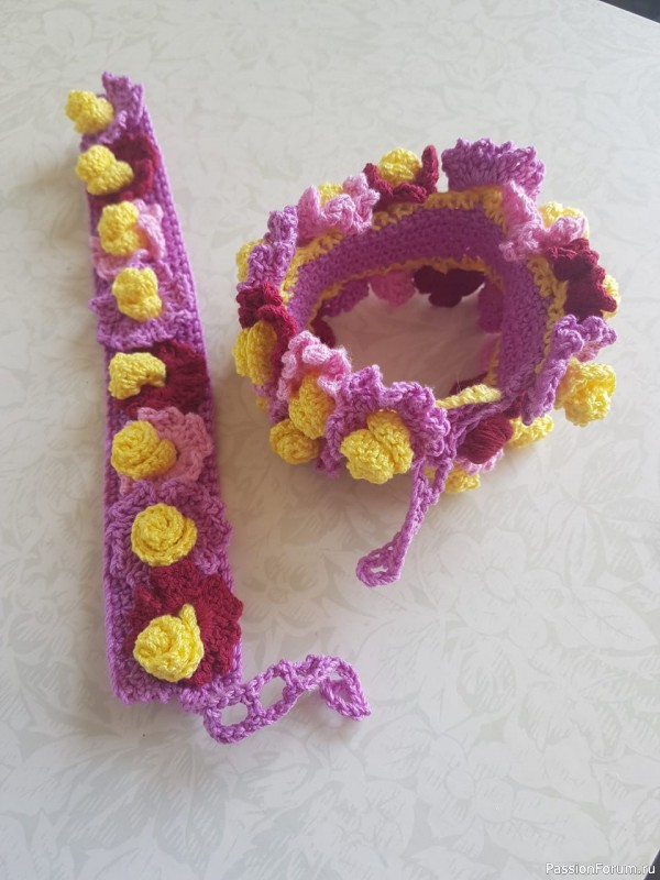 Браслет выполнен крючком из хлопковой пряжи. Яркий, весенний. Прекрасно подойдет для летней одежды. Имеется два размера: 5 см и 3 см. Размер по запястью регулируется застежкой. Пуговичка тоже ручной работы. Чем больше на него смотрю, тем больше нравится.