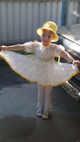 Платье связано с турецкой пряжи "Етамин"-ушло 180гр(6 моточков по 30гр-180 м) и жёлтого "СОСО"-не помню сколько,крючок1,5
