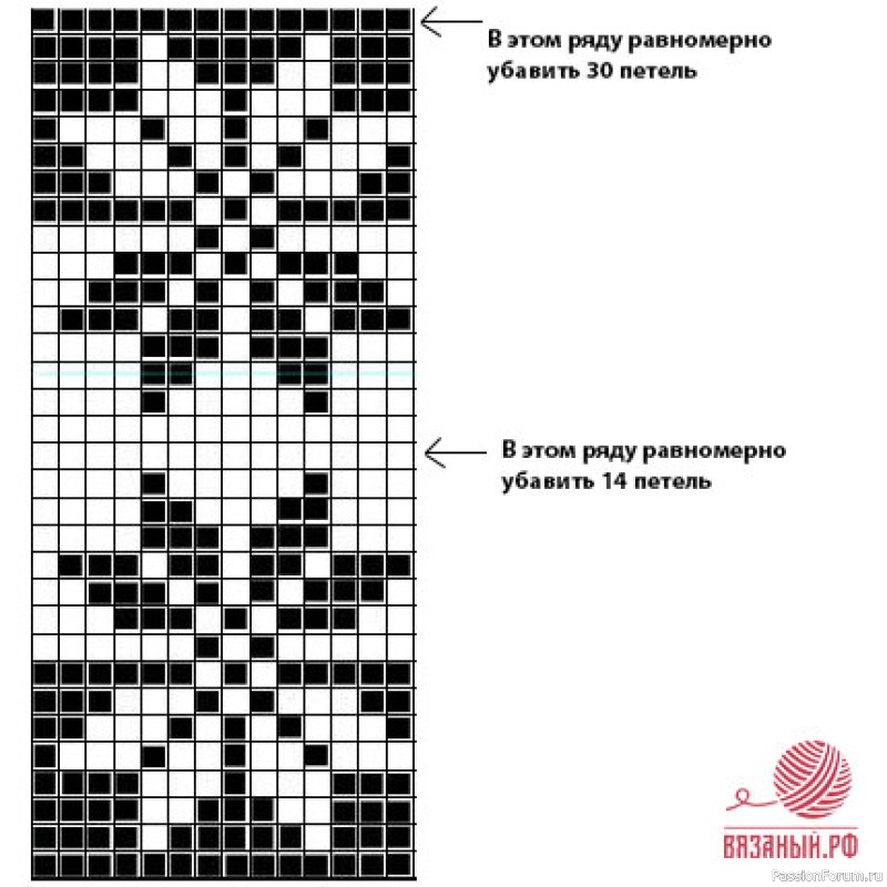 Вяжем лицевой гладью круговыми рядами, при этом в 1-ом ряду убавляем для регланных скосов 8 петель таким образом: перед и после каждого маркера провязываем 2 п. вместе лицевой скрещенной. Убавки повторяем в каждом 2-ом ряду еще 3 раза. Далее начинаем вывязывать рисунок по схеме.