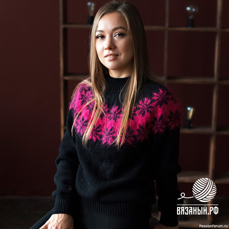 Мы предлагаем связать пуловер с жаккардовым узором «снежинки». Такой узор будет смотреться нарядно и одновременно уютно, комфортно, по-домашнему.