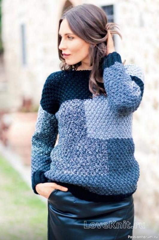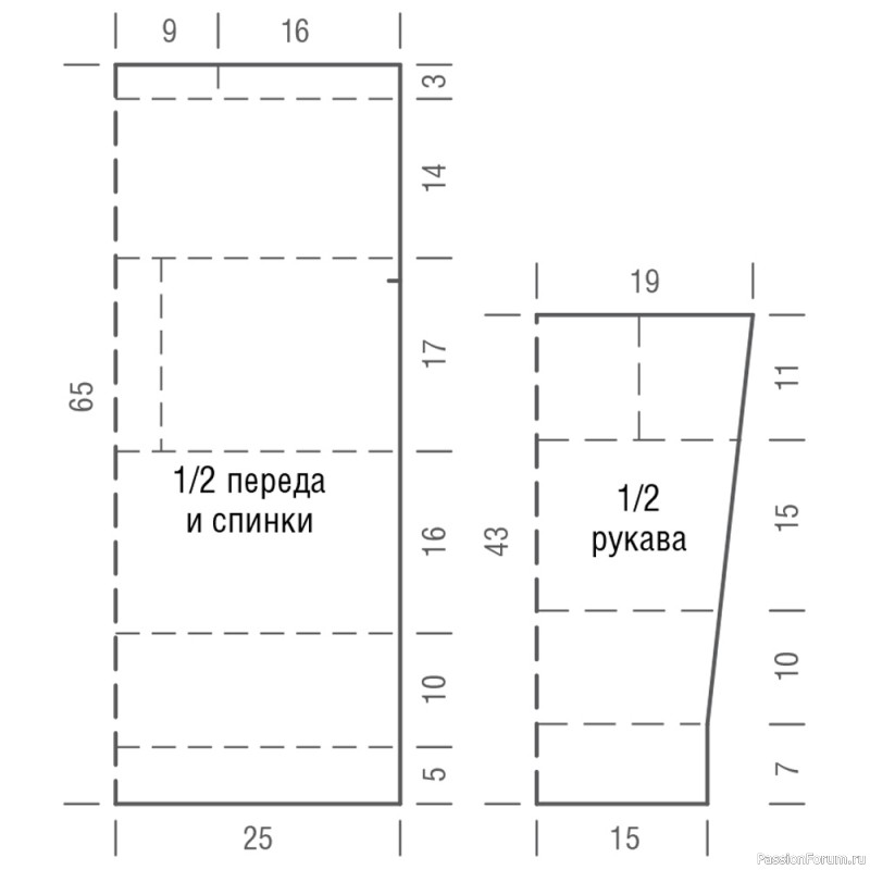 Сборка: вязаные детали наколоть на выкройку, увлажнить и оставить до высыхания. Выполнить плечевые. боковые швы и швы рукавов. Вшить рукава.
