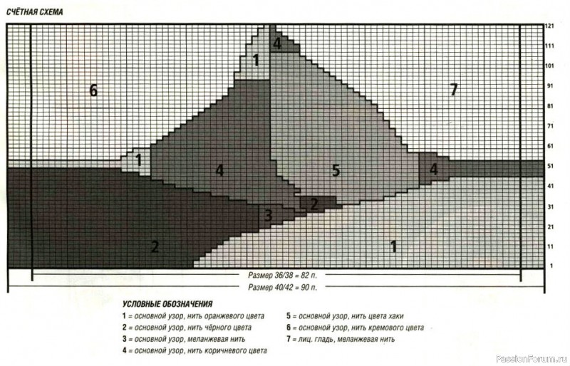 Перед: вязать, как спинку, кроме выреза горловины. После резинки вязать по счётной схеме. Через 55 см, по окончании схемы, закрыть все петли.Рукава: нитью коричневого цвета набрать 46 п. и связать 1 изн. р. изн., затем основным узором 12 р. нитью коричневого цвета, 4 р. нитью чёрного цвета, 2 р. нитью коричневого цвета, 6 р. нитью оранжевого цвета, 2 р. нитью коричневого цвета, 2 р. меланжевой нитью, 4 р. нитью коричневого цвета, 6 р. нитью цвета хаки, 2 р. нитью коричневого цвета, 8 р. нитью кремового цвета, продолжить вязать нитью коричневого цвета. Одновременно прибавить с обеих сторон после 13 р. от наборного края 1 х 1 п., затем в каждом 10-м р. 6 х 1 п. (в каждом 8-м р. 5 х 1 п. и в каждом 6-м р. 4 х 1 п.) = 60 (66) п. Через 32 см закрыть все петли.