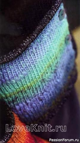 Вам потребуется: пряжа 1 (100% шерсти; 100 г/100 м) — 6 (6) 7 мотков черной; пряжа секционного крашения 2 (100% шерсти; 100 г/110 м) — 2 мотка сине-зеленой, 3 мотка красно-оранжево-желтой; пряжа 3 (80% вискозы, 20% полиэстера; 25 г/100 м) — 4 мотка серебристо-черной; спицы № 6; круговые спицы № 6 длиной 80 см; вспомогательные спицы № 3,5; 5 пуговиц диаметром 22 мм.