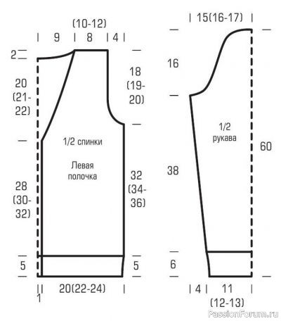 На спицы № 3,5 набрать 48 (53-58) п., связать 5 см = 20 р. резинкой. Перейти на спицы № 4,5 и вязать лиц. гладью. Через 28 (30-32) см = 90 (96-104) р. от планки для скоса выреза выделенными убавлениями убавить с левой стороны 1 п., затем в каждом 4-м р. 15×1 п. и в каждом 2-м р. 3 х 1 п. Одновременно выполнить с правой стороны пройму, как для спинки. Оставшиеся 20 (25-30) п. плеча закрыть на высоте спинки.