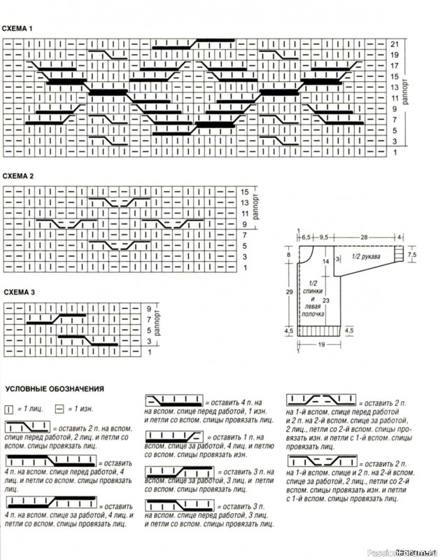 Рельефный узор 1: вязать по схеме 1, на которой приведены только лиц. р., в изн. р. петли вязать по рисунку. Выполнить 1 раз с 1-го по 22-й р… затем повторять с 3-го по 22-й р.