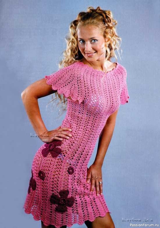 Изделие вяжется сверху вниз. Наберите цепочку из возд. п., замкните в кольцо. Вяжите узором по схеме 1 в соответствии с выкройкой. Расширения (для подола) и убавления (для талии) выполняйте за счет равномерного увеличения либо уменьшения количества столбиков в «веерах» и добавления «вееров» (на талии в каждом «веере» 5 ст., а на бедрах — 8). Вырез горловины и проймы обвяжите столбиками б/н с «пико».