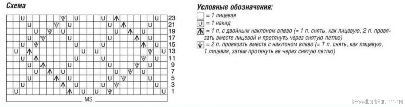 Узор 3: ажурный узор = круговые ряды (число петель кратно 24) = вязать согл, схеме. На ней даны нечетные круговые ряды. В четных круговых рядах все петли и накиды провязывать лицевыми. Раппорт постоянно повторять. Выполнить 2 раза 1-24-й круговые ряды.