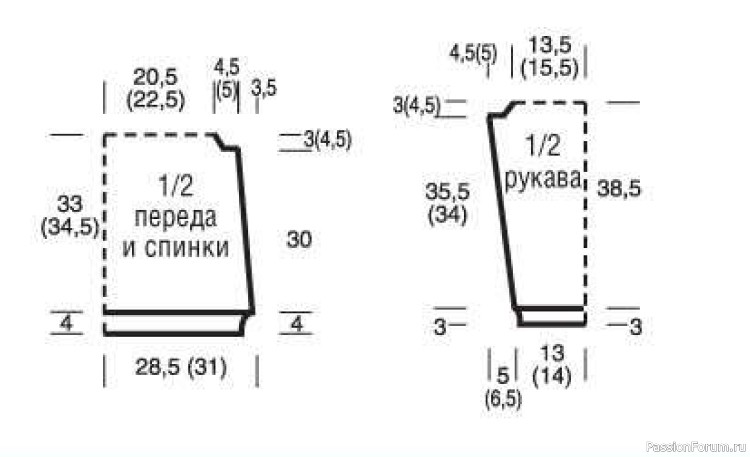 Спинка: набрать на спицы 100 (108) п. крестообразным способом и для нижней планки связать 4 см узором 1. Продолжить работу узором 2. Одновременно подчеркнуто убавить для бокового скоса с обеих сторон в каждом 12-м ряду от нижней планки 6 х 1 п. = 88 (96) п. Через 30 см = 84 ряда от нижней планки закрыть для короткого регланного скоса с обеих сторон 1 х 5 п., затем подчеркнуто убавить в каждом 2-м ряду 3 х 1 п. и в 4-м ряду 0 (1) х 1 п. Через 33 см = 92 ряда (34.5 см = 96 рядов) от нижней планки отложить оставшиеся 72 (78) п.