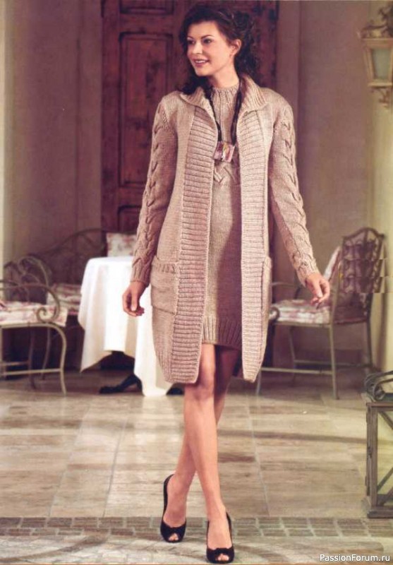 Рукав: на спицы № 4 набрать 46 п. и связать 6 р. двойной резинкой, далее вязать резинкой 2/2. Через 6 см от наборного края перейти но спицы № 4,5 и вязать след. образом, равномерно прибавив в 1-м р. 1 х 12 п: 2 п. лиц. гладью, 58 п. особым узором, 2 п. лиц. гладью; при этом прибавлять с обеих сторон в каждом 8-м р. 13 х 1 п, и вязать прибавленные петли лиц. гладью. Через 44 см от резинки для оката рукава закрыть с обеих сторон 1 х 3 п. и затем убавлять после первой и перед последней п. в каждом 2-м р, 12 х 1 п.; закрыть с обеих сторон 1 х 8 п. Через 12 см от начала оката рукава закрыть оставшиеся 38 п.