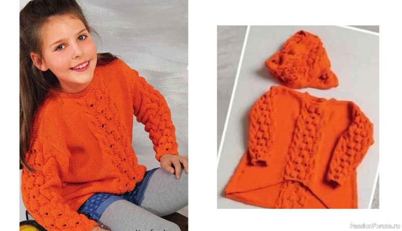 Оранжевый пуловер просто изобилует особенными деталями: расклешенный силуэт с укороченным передом сейчас на пике популярности, объемный узор в середине притягивает взгляды, а широкий снуд станет отличным дополнением. Вязание для детей спицами, схема, выкройка и описание вязания.