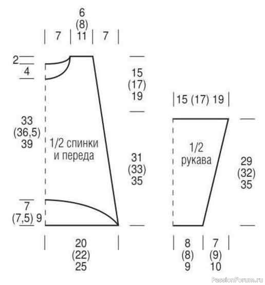 Для боковых скосов в каждом 6-м р. с обеих сторон прибавить 8 (4) 4 х 1 п., затем в каждом 4-м р. с обеих сторон прибавить 4 (12) 14 х 1 п. Через 29 (32) 35 см от начального ряда все петли закрыть прямо.
