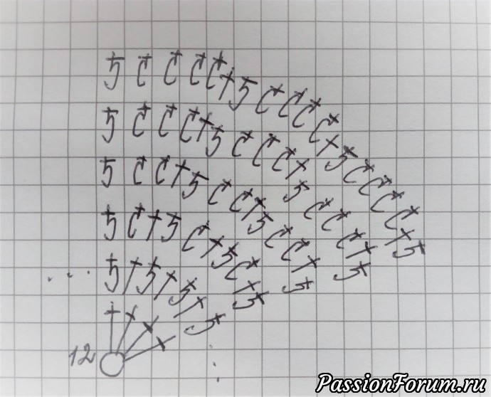 4- и дальнейшие ряды - прибавляйте по 1 столбику с накидом в каждом секторе с одной стороны, например, после выпуклого рельефного столбика. В следующем ряду на его основе свяжете вогнутый столбик, а перед ним прибавите опять столбик с накидом. На схеме это видно.