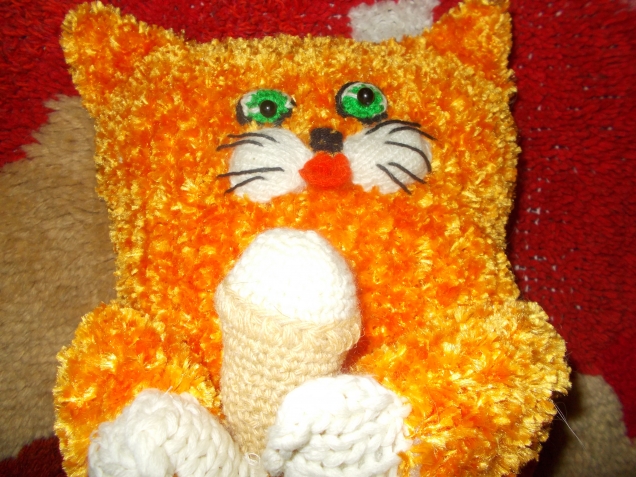 Вот этот, полосатый, Федор, был связан и подарен знакомой. Размер примерно 50х24 см(без лапок). Он чистошерстяной и горд этим. Считает себя самым умным. Наверное, сейчас учит семью моей знакомой уму-разуму.