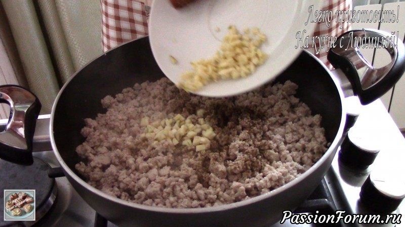 1. Приготовлю начинку. На сухой сковороде обжариваю мясной фарш до готовности, постоянно его перемешивая и разбивая комочки. Затем его солю, перчу и добавляю к нему мелко порезанный чеснок, все перемешиваю и обжариваю еще примерно минуту. Убираю сковороду с плиты и перекладываю готовый фарш в миску, чтобы он быстрее остыл.