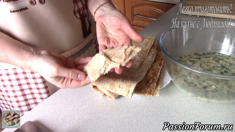 Тонкий лаваш рву руками на небольшие (не мелкие, но и не очень крупные) кусочки и кладу в миску с яичной смесью.