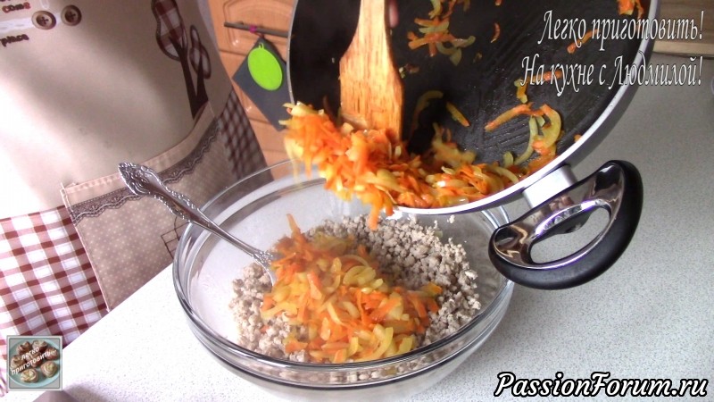 Порезанный четвертькольцами лук и натертую на крупной терке морковь обжариваю на небольшом количестве растительного масла до мягкости. А затем перекладываю в миску с готовым фаршем и перемешиваю. Даю им остыть до комнатной температуры.