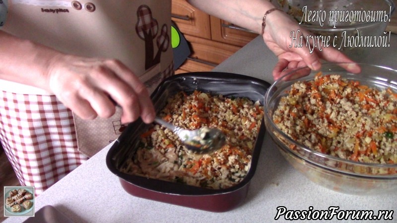 3. Собираю пирог. Форму смазываю сливочным маслом, но можно и растительным. Первым нижним слоем равномерно выкладываю примерно половину подготовленного лаваша в заливке. Не уплотняю его. Затем на него выкладываю всю подготовленную остывшую начинку из фарша (иногда половину фарша я заменяю отваренной и мелко порезанной цветной капустой). Верхним слоем выкладываю равномерно весь оставшийся лаваш, не уплотняю его, но сглаживаю верх, иначе торчащие края лаваша могут зажариться раньше, чем подрумянится весь пирог.