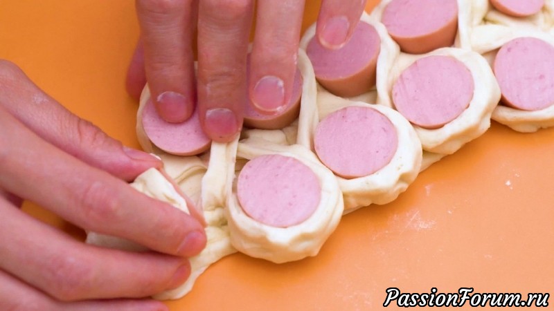 Кладем сосиску в прямоугольник теста, фиксируем тесто сбоку, снизу и сверху. Получается сосиска в футляре из теста. Теперь кладем этот футляр вниз швом и на расстоянии 0,5 - 1 см разрезаем сосиску поперёк, не задев при этом нижний шов. Теперь раскрываем кружочки сосиски в тесте поочередно в каждую сторону.