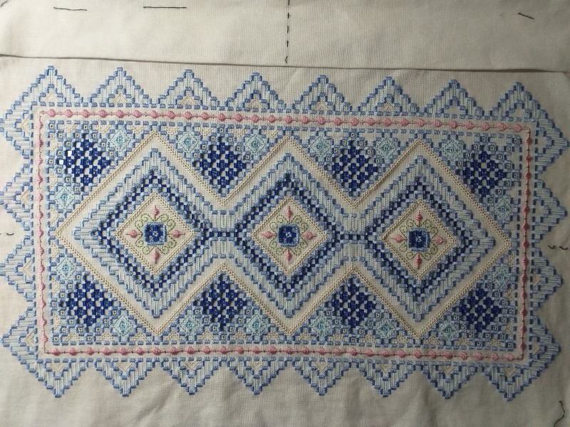 Будем украшать нашу вышивку. На этом этапе будем вышивать ажур в ромбах , нестандартные блоки в треугольниках и новый элементом хардангера "голубиный глаз" (Doves Eye). Очень подробно нас этому элементу учила наша учительница Milli http://magic-hardanger.blogspot.com/2014/05/8-dove... . Предлагаю внимательно прочитать ее урок
