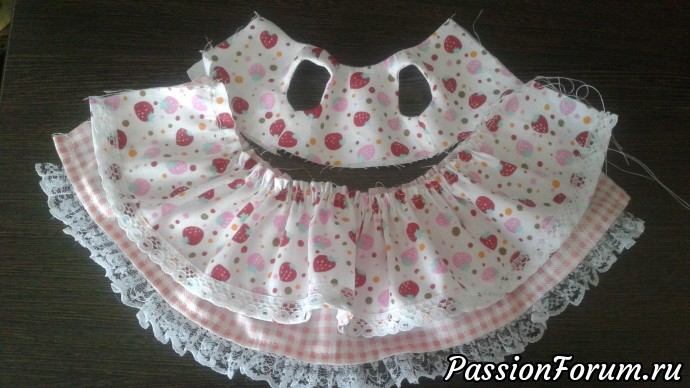 Выкраиваем две юбки. Это прямоугольники 40х10,5 см (нижняя юбка) и 45х9 см, припуски не учтены, это лишь конечный размер.Украшаем юбки кружевом, собираем по верху. Делаем подгибку по краям.