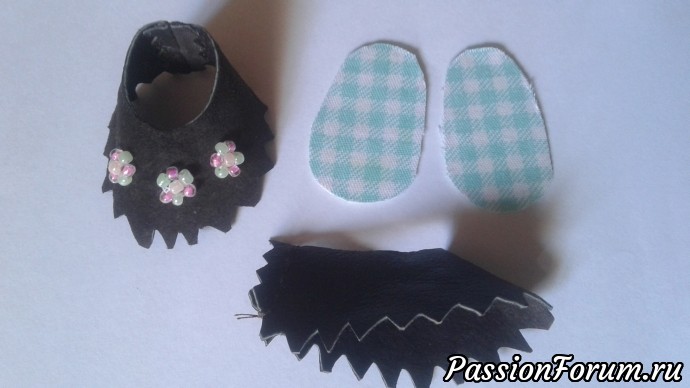 Для туфелек выкраиваем две детали верха туфелек и две подошвы из картона. На картон приклеиваем ткань, чтобы туфельки внутри были красивыми. По изнаночной стороне выполняем задний шов.Разгибаем его в разные стороны и фиксируем клеем. Украшаем туфельки на свой вкус. У меня цветочки из трех цветов бисера в цвет платья просто пришиты к передней части туфель." title="> Для туфелек выкраиваем две детали верха туфелек и две подошвы из картона. На картон приклеиваем ткань, чтобы туфельки внутри были красивыми. По изнаночной стороне выполняем задний шов.Разгибаем его в разные стороны и фиксируем клеем. Украшаем туфельки на свой вкус. У меня цветочки из трех цветов бисера в цвет платья просто пришиты к передней части туфель.">>