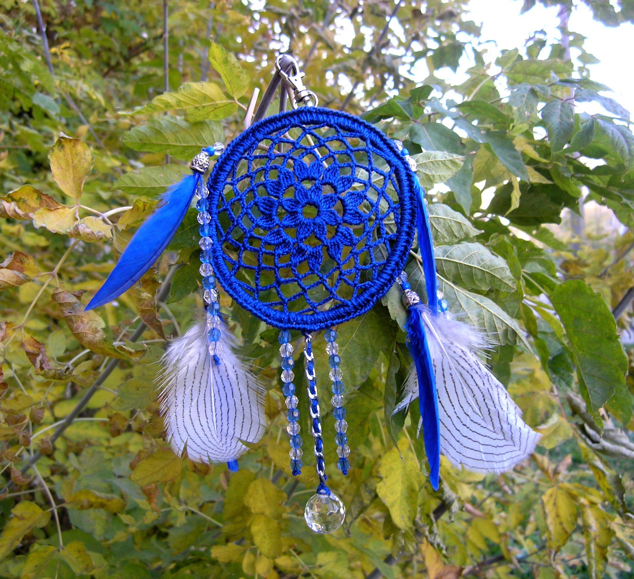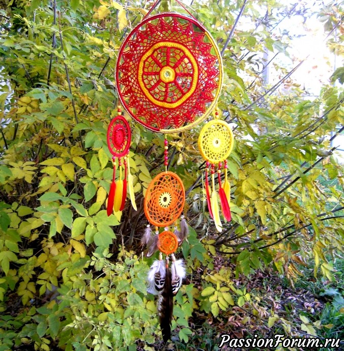 Загорелась связать Ловца снов, начала готовится к работе, оказалось, что с фурнитурой как всегда проблема, то по цвету не подходит, то нет нужного диаметра, со стеклянными бусинами вообще очень трудно, в магазинах один пластик. Нашла наконец деревянные, и стеклянные бусины, даже подвеску из горного хрусталя приобрела .Вяжу ловца для брата , ( он решил оформить спальню по фуншую), а для мужчины необходимы перья сокола. Перьев сокола не нашла, но нашла перо коршуна, тоже хищник, значит подойдёт. Вязала с вдохновением, есть конечно косяки, но это мой первый Ловец, дальше будет лучше, намереваюсь подарить всем любимым родственникам и друзьям по Ловцу. Представляю вашему вниманию Ловца снов "Солнечный свет", длинна 83 см. И амулет для салона машины - Ловец снов "Синее озеро", длинна 22 см.