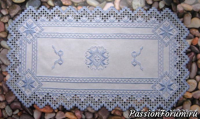 Собираясь очередной раз в отпуск на море, взяла отрез голубой Луганы25 и голубые ниточки СапфирЛюкс и Канарис. Мамен Ариас любезно предоставила доступ к схеме Нессесера, которую я "адаптировала" под дорожку))). И, буквально на следующий день по прибытии в Евпаторию, даже не днём, а ранним-ранним утром начала вышивать. Какое же это блаженство - тишина, огромное голубое небо, чуть вдалеке виднеется море, чашка кофе и вышивка.... час-полтора пролетают как одно мгновенье. Затем появляются звуки просыпающегося города, запахи готовящихся завтраков... начинает припекать солнышко.... Пора будить "половинку", и - на море.