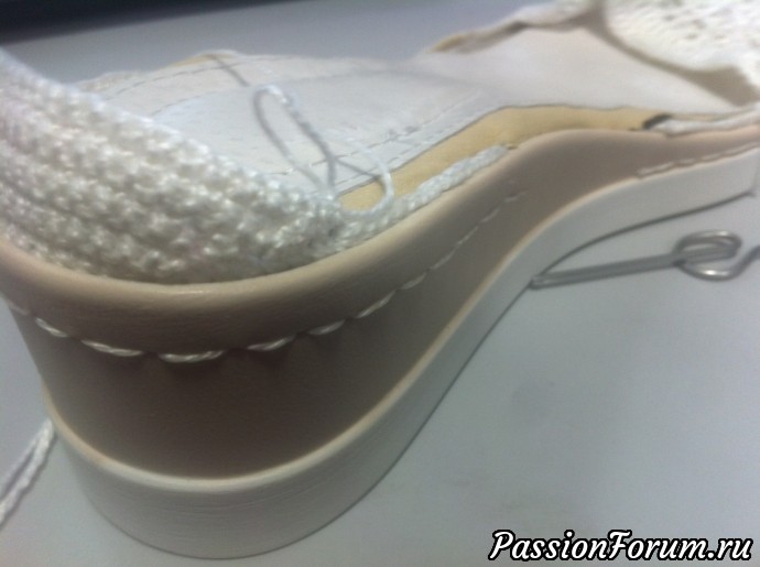 Когда всё прошито, нитки затаскиваю во внутрь, там они спрячутся под стелькой.
