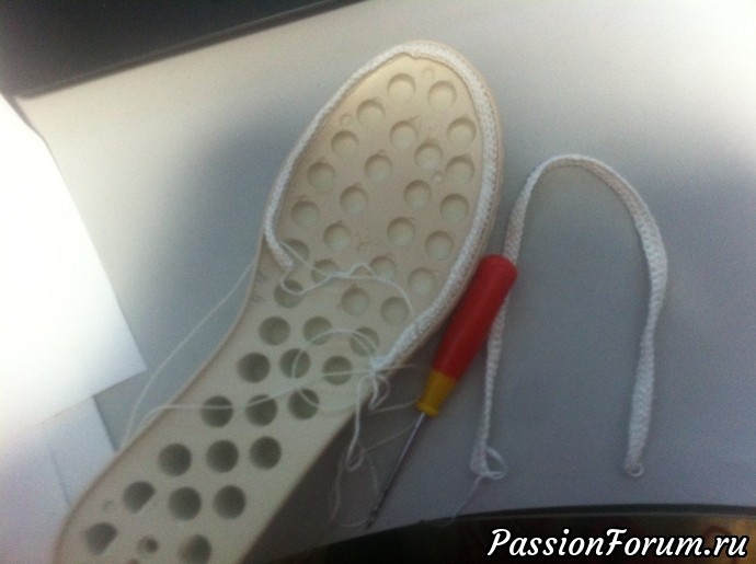 На подошве отмечаем размер носочка и пятки (если вязать другую обувку,ботинки туфли...то вяжем на весь круг) Вывязываем полоски нужной длины два ряда,столбик без накида.