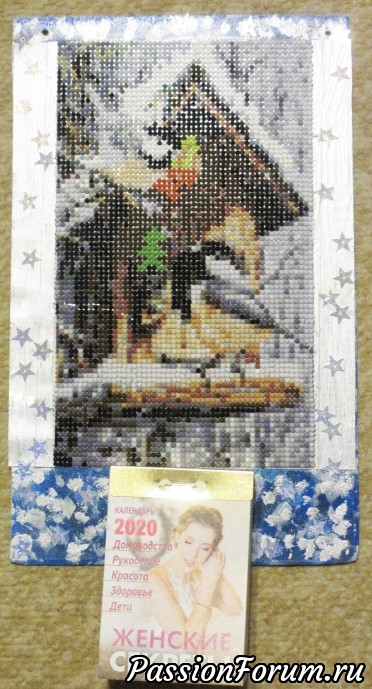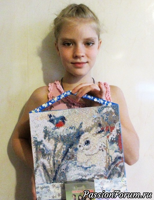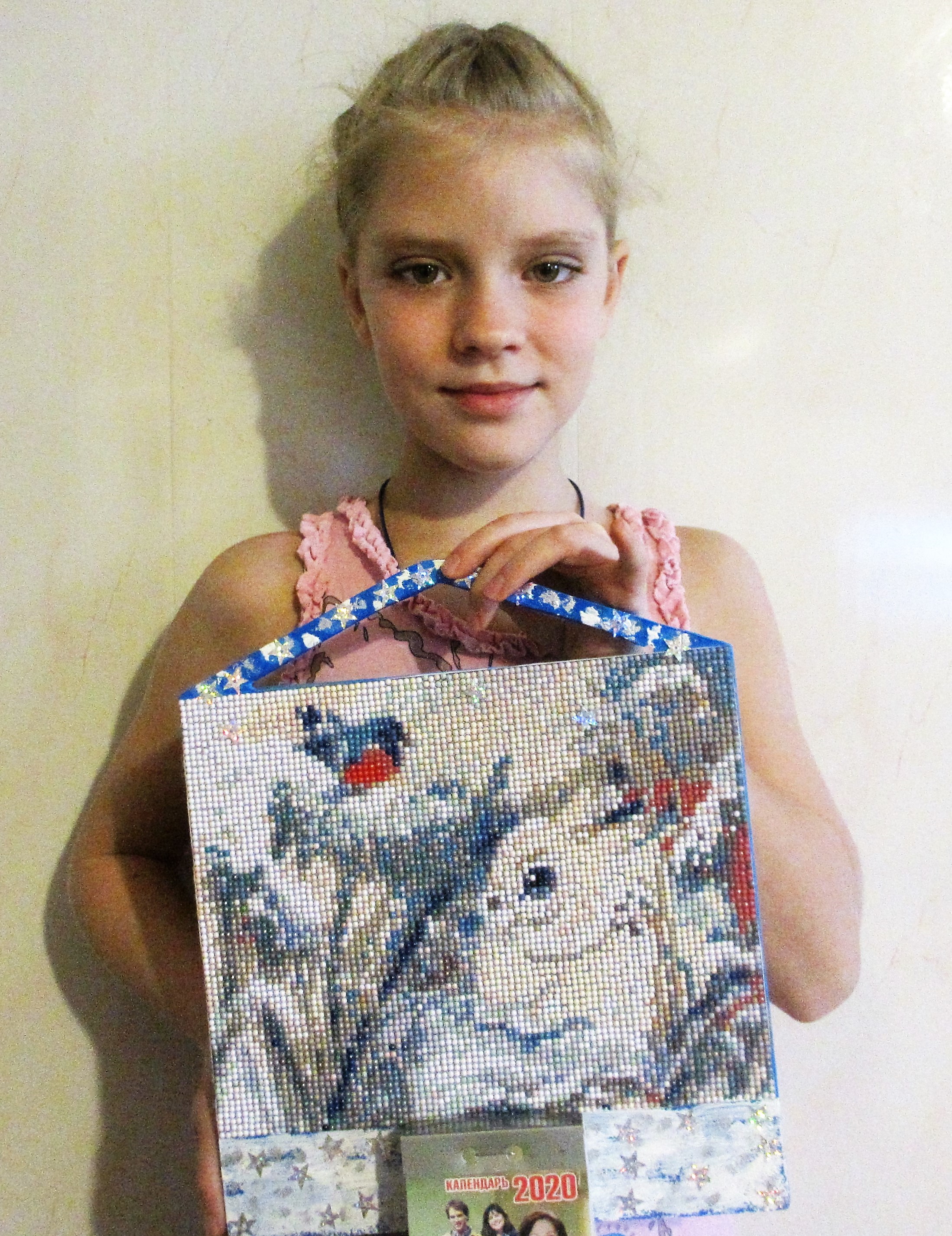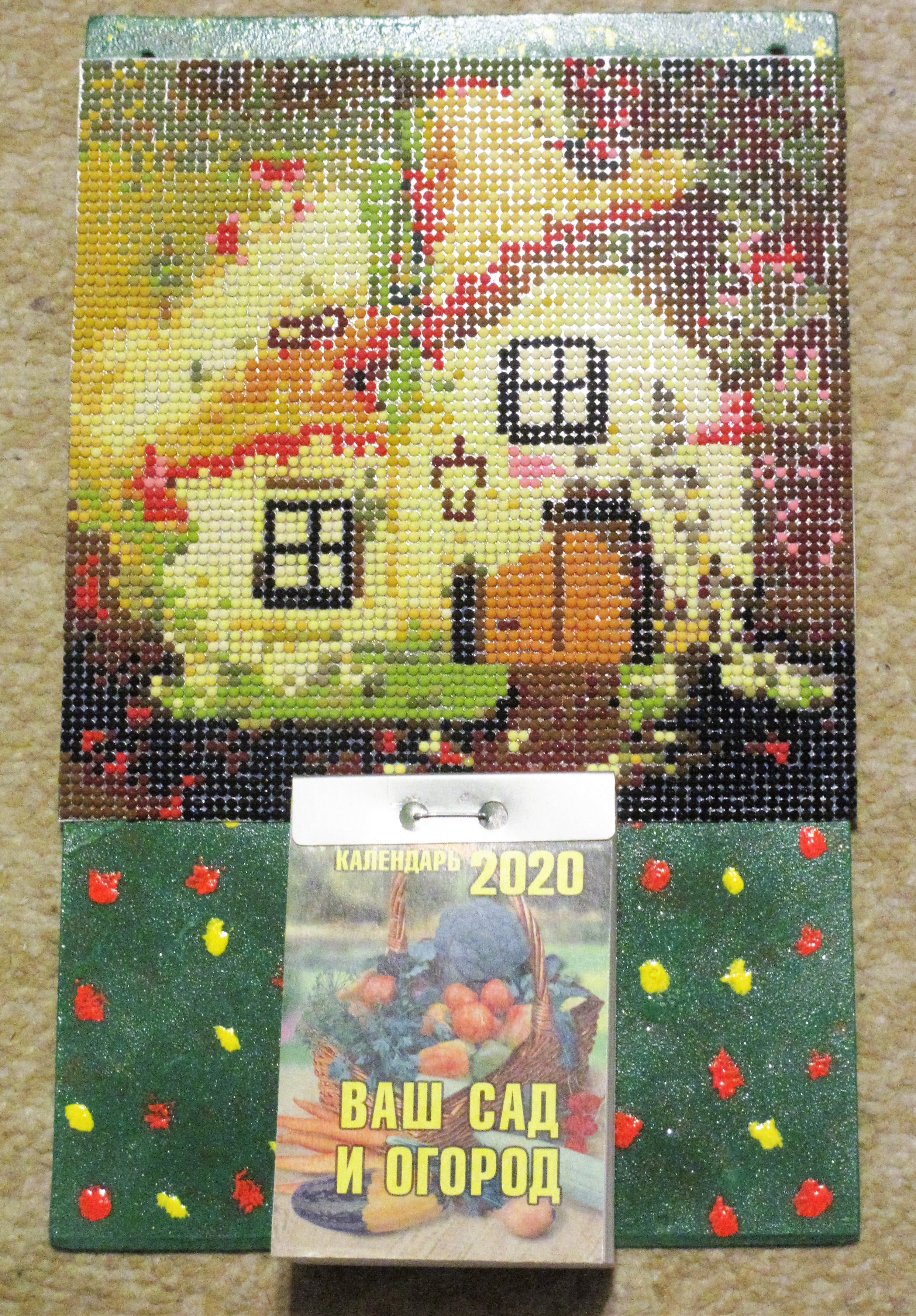 Мы с внучками выкладываем алмазные картины, одарили родственников, знакомых и друзей. В этом году в подарок сделали подвесы для календарей, применив небольшие алмазки. Дедушка вырезал основу из ДВП, мы с девочками выложили картины. Основу разрисовывали внучки, я приклеивала алмазки на фон. Прикрепили календари. На подвесы уже есть претенденты. Внучки участвуют с зимними календарными домиками в конкурсе.