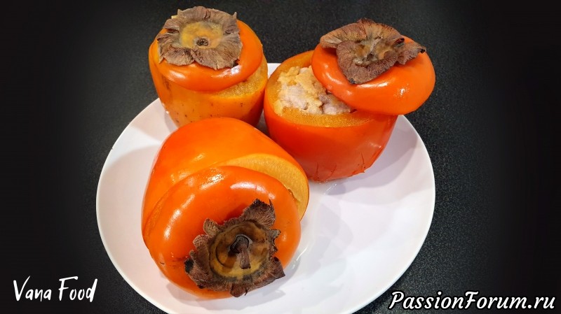 Переложить фаршированную хурму на противень и поставить в разогретую до 180°С духовку на 30 минут.