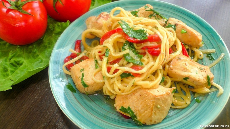 Куриное филе остается невероятно мягким и сочным, а лапша сразу готова к подаче с вкусным соусом.